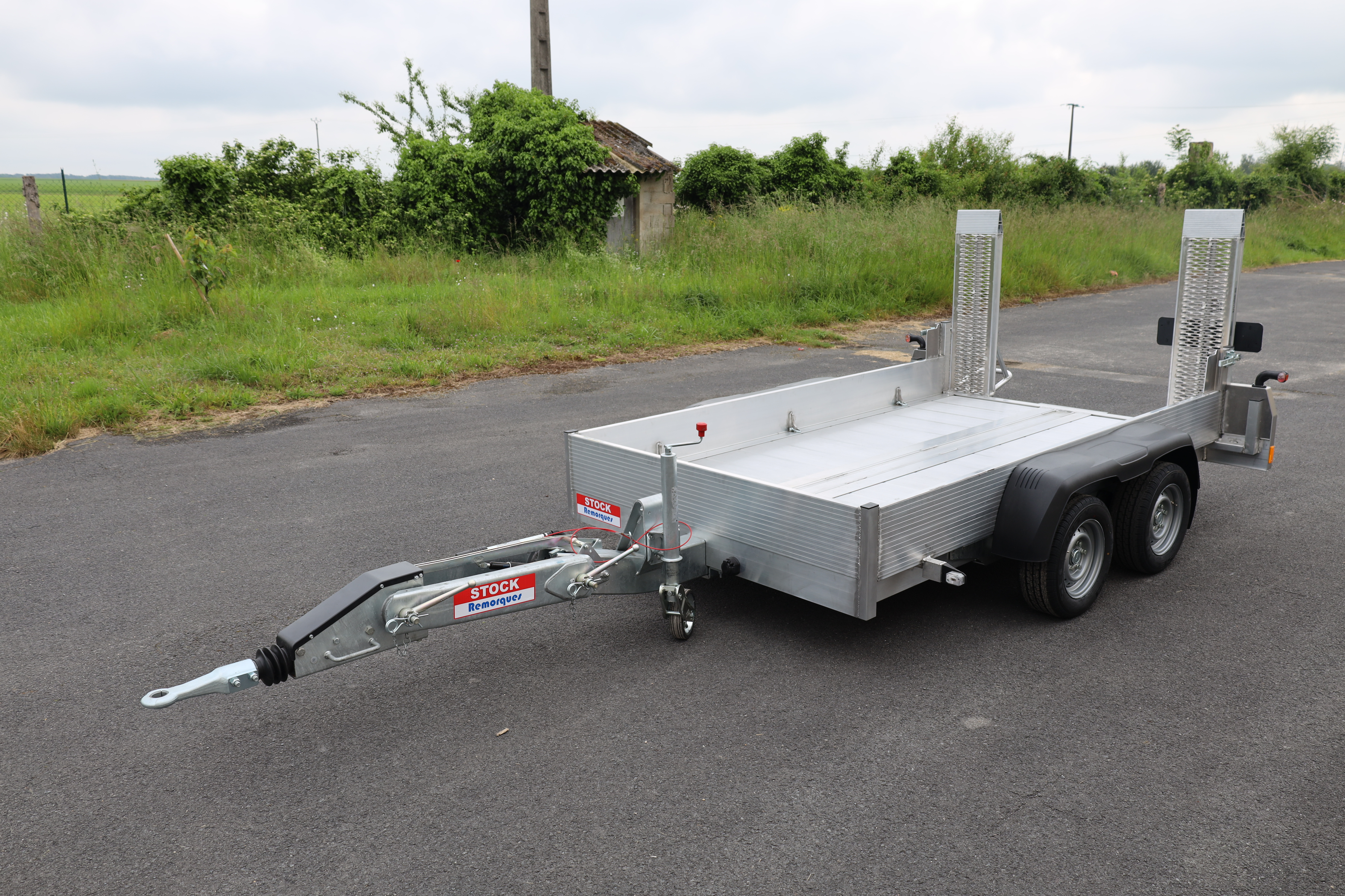 Pour votre nacelle, petit engin de chantier, pelleteuse.... Nous vous proposons des remorques très robuste permettant de charger au plus bas et avec une pente faible.